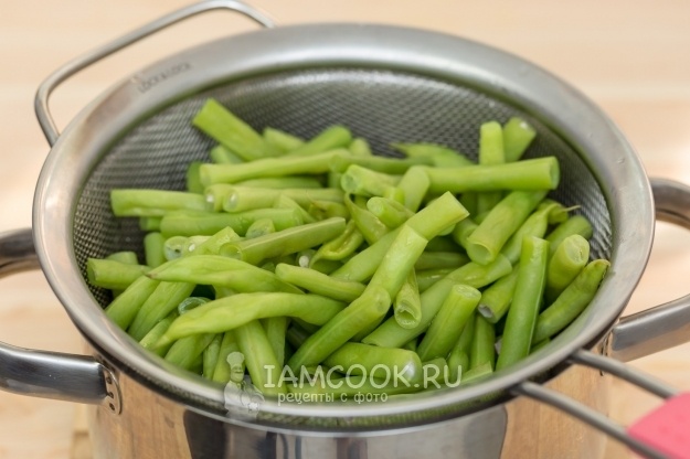 Параллельно подготавливаем 500 г фасоли: если она замороженная, просто отправляем её в кипяток. Режем стручки пополам или на три части и варим 3 минуты в подсоленной воде. После варки сливаем лишнюю воду и даём фасоли стечь.