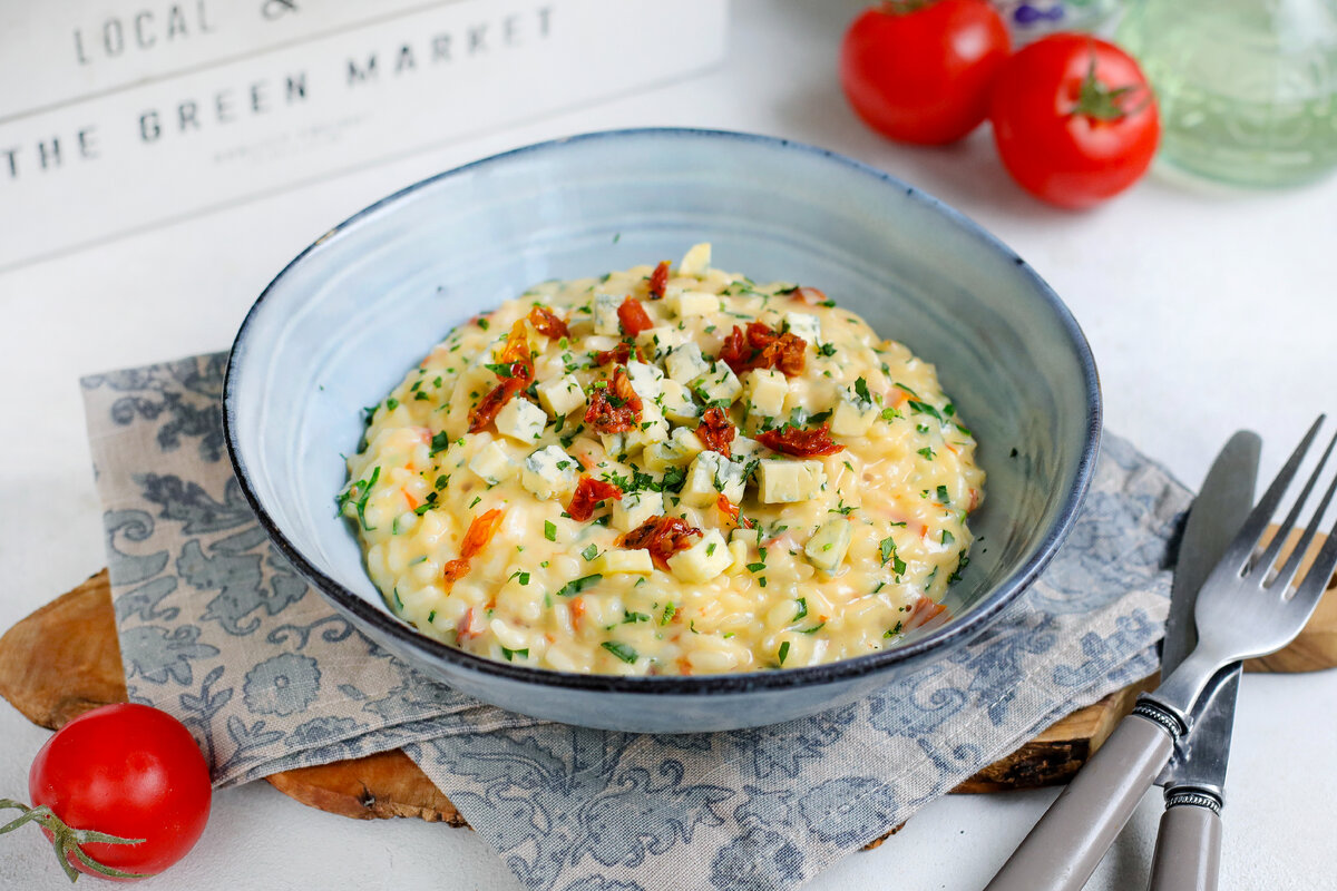 Шаг 4: Мелко нарезать петрушку, сыр и вяленые томаты. В конце приготовления добавить сливки, сыр, петрушку и томаты. Прогреть еще 1-2 минуты до загустевания. Подавайте ризотто немедленно!