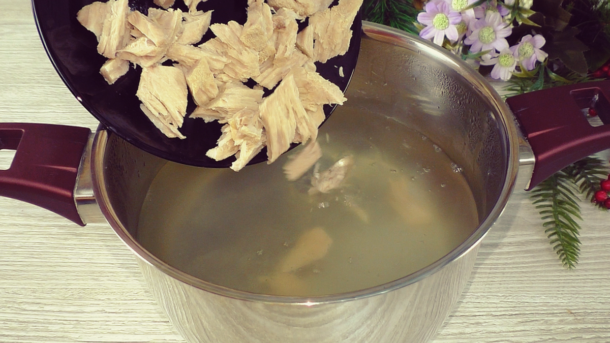 Начните с приготовления бульона. Для этого поместите мясо в кастрюлю с водой и доведите до кипения. Если хотите, бульон можно сварить заранее, чтобы сэкономить время. Готовое мясо извлеките, отделите от костей и нарежьте, а затем верните обратно в кастрюлю.