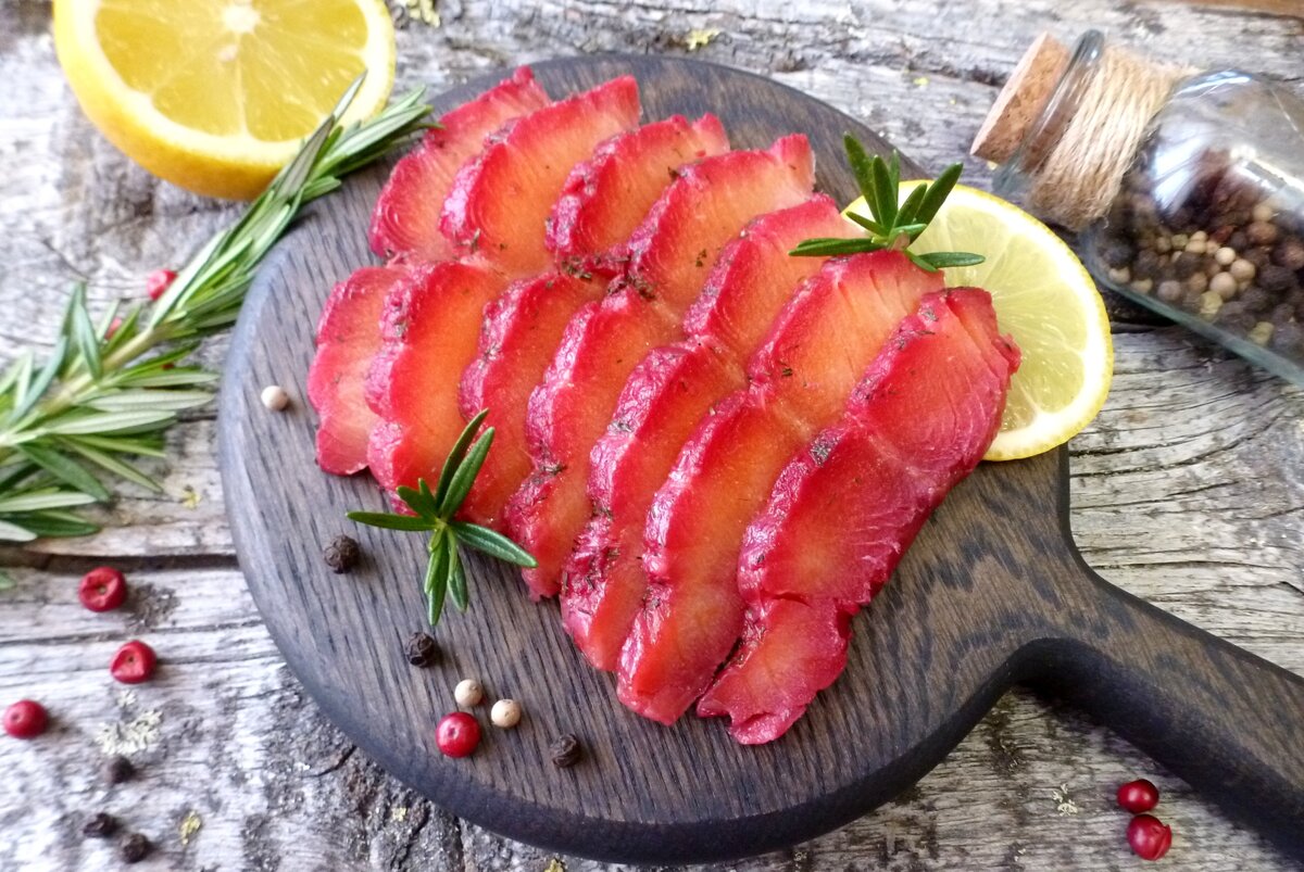 Готовую рыбку нужно отправить в холодильник минимум на сутки. Через 7-10 часов рекомендуется перевернуть упаковку. После того, как рыба будет готова, свеклу удаляют, и для легкости нарезки можно немного подморозить филе. Затем тонкими ломтиками сервируйте на стол — ни один гость не устоит перед этим вкусным угощением!