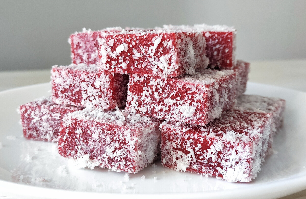 - Порежьте и обваляйте: Выньте застывший мармелад из контейнера, нарежьте кубиками и обваляйте их в кокосовой стружке или другом выбранном ингредиенте.
