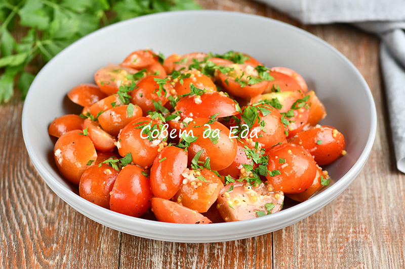 В небольшой банке соедините пропущенный через пресс чеснок, соль, сахар (в качестве альтернативы можно использовать мед) и зернистую горчицу. Если хотите, замените зернистую горчицу на острую, добавив меньшее количество.Добавьте лимонный сок, растительное масло и сушеный базилик. Испытайте на вкус, можно добавить другие любимые травы.Закройте банку и хорошенько встряхните до полного растворения соли и сахара.Полученная заправка получится густой и ароматной. Она прекрасно подойдет не только для этих помидоров, но и для овощных запечек – просто скорректируйте количество ингредиентов по своему вкусу.Приготовьте помидоры, нарезав их для мелких на половинки, а крупные — на дольки.Добавьте заправку к помидорам и тщательно перемешайте.Закуска готова! Храните ее в холодильнике в течение трех дней, не теряя оригинального вкуса.Готовые помидоры лучше всего подавать на тарелке, посыпав свежей зеленью. Это отличное сочетание сочных овощей, кислоты заправки и пряностей — настоящая палитра вкусов, от которой трудно отказаться!