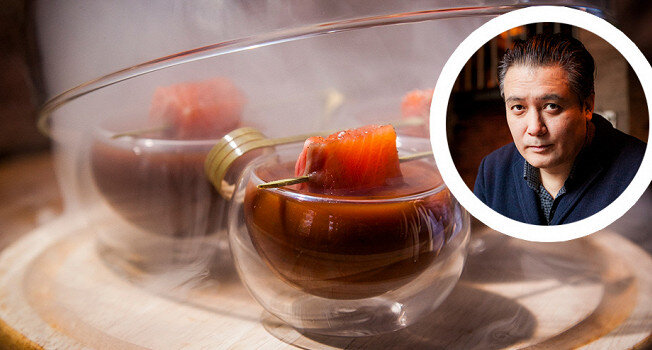 - Следующая – «Севиче Мэри» с солеными помидорами, сельдереевым соком и устричным соусом, подается с копченым лососем под стеклянной крышкой с ольховым дымом, который разжигает аппетит.