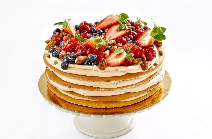На сервировочную тарелку нанесите немного крема и уложите первый корж, после чего промажьте его кремом и добавьте наполнители. Промажьте и верхний корж, накрывая торт оставшимся кремом. Для идеальной отделки поместите торт в холодильник минимум на 6-12 часов для пропитывания.