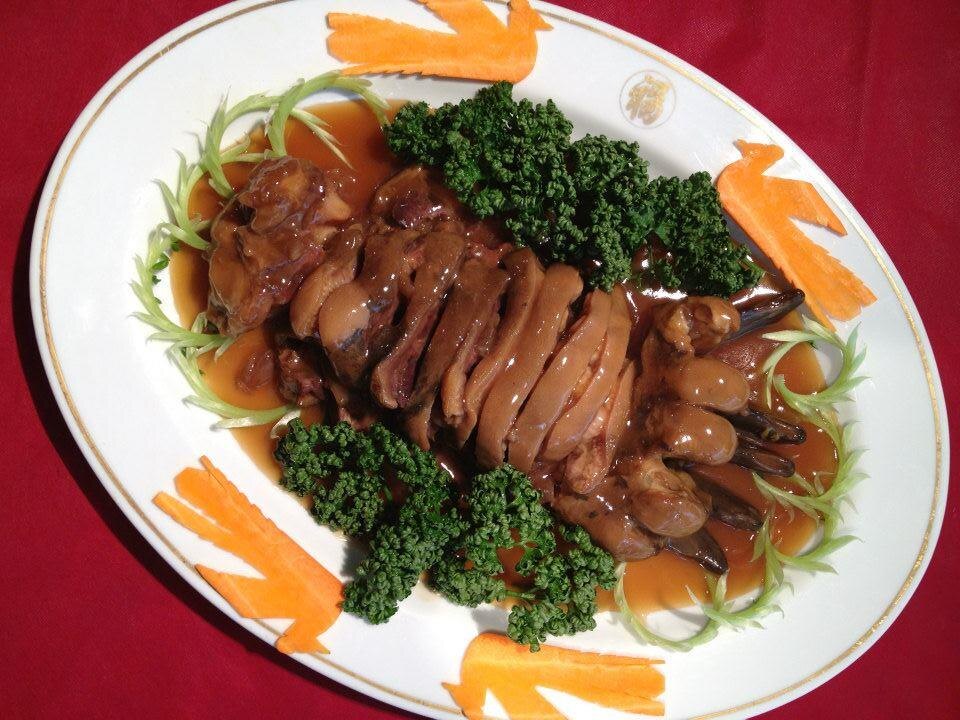 Взять литр куриного бульона, часть имбиря и зелёного лука, приправить солью и специями, добавить 50 миллилитров вина. Довести до кипения и проварить лапу 10-15 минут, повторяя процедуру еще два раза с новым бульоном.