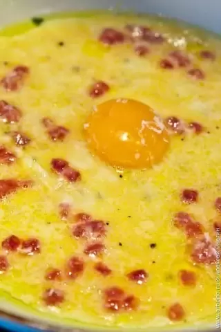 После тщательного взбивания яиц их следует вылить на сковороду и готовить до образования легкой золотистой корочки. Затем аккуратно в центр обжаренного набора помещается отложенный желток, который придаст яству последнего штриха.