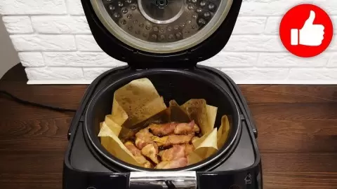 На дно чаши мультиварки укладывается бумага для выпечки, чтобы бекон не прилип. Кусочки курицы помещаются в мультиварку, и оставшийся маринад равномерно распределяется сверху. Готовьте на режиме «мультиповар», выставив температуру на 130°C, в течение 30 минут.