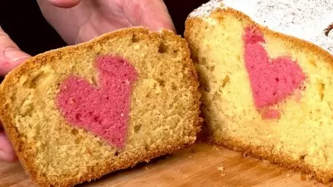 Застелите форму для кекса размером 12 ? 24 см рапертентом. Вылейте немного основного теста на дно формы, затем уложите нарезанные сердечки, залейте оставшимся тестом. Выпекайте при 180°C около 40-50 минут, проверяя готовность деревянной шпажкой. Когда кекс остынет, посыпьте его сахарной пудрой или украсьте глазурью, чтобы сделать его по-настоящему праздничным.