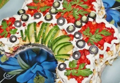 Обратите внимание на финальные штрихи: украсить салат можно кружочками маслин или оливок, свежей зеленью или даже мелкими маринованными шампиньонами. Не забудьте добавить немного майонезного узора для завершенности визуального эффекта.
