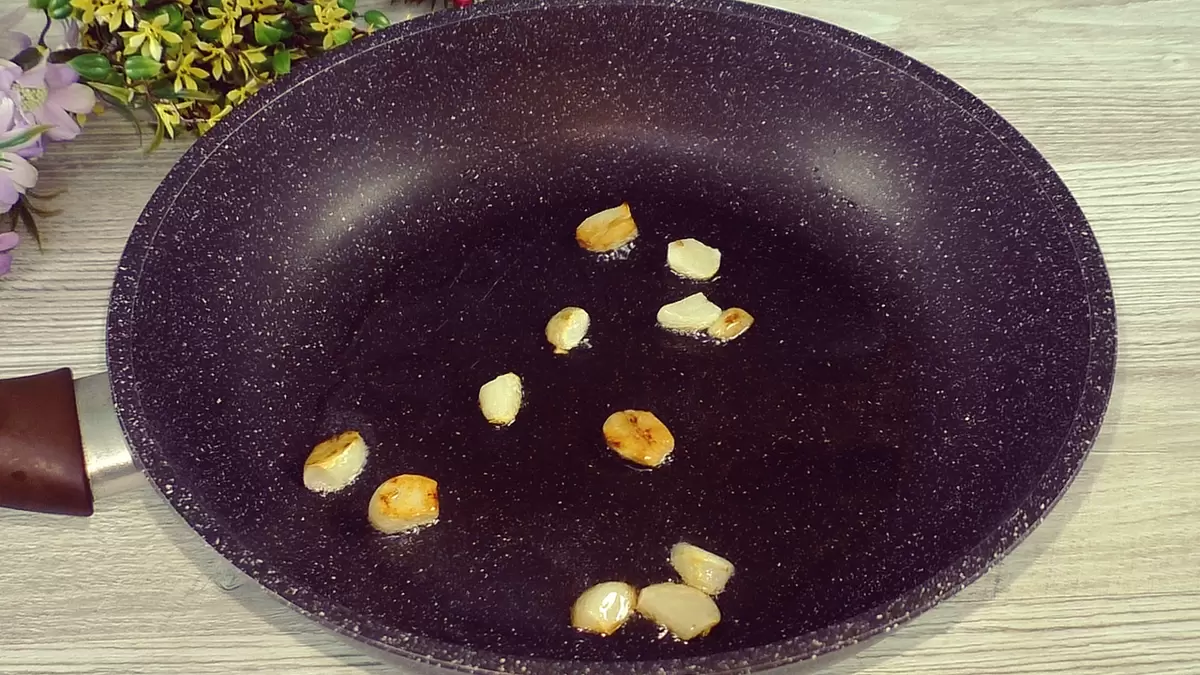 Тем временем на сковороде разогревают растительное масло и обжаривают зубчики чеснока до золотистого цвета. Затем их нужно убрать, так как больше в рецепте они не понадобятся.