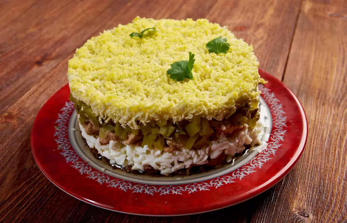 Слоеные салаты обладают особым шармом, и если вы в поиске чего-то новенького для праздничного стола, этот рецепт салата «Мимоза» точно вас заинтересует. В нем гармонично сочетаются печень трески и жареные грибы, а оформление по-прежнему остается классическим.