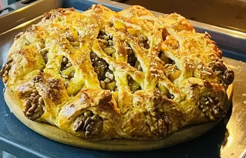 Первый шаг — замесить тесто и оставить его в холодильнике на некоторое время. За это время следует подготовить начинку: яблоки нарезать тонкими ломтиками, добавить сахар и корицу. Опционально можно добавить грецкие орехи. Достав тесто из холодильника, его нужно раскатать в круглый пласт. Сделав незначительные надрезы, формируются бортики для пирога. В центр выкладывается яблочная начинка, а сверху щедро посыпаются орехи.
