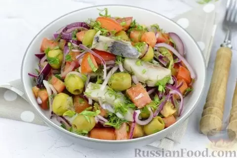 - Салат с сельдью и оливками: Яркие помидоры, маринованный лук и оливковое масло обеспечивают оригинальный вкус. Этот салат хорошо подходит для легких ужинов и закусок с вином.