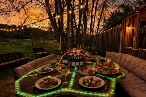 Функциональным центром «Каду» станет специальный стол, форма которого точно повторяет контуры виноградника. Он будет объединять в себе карту посадки лоз, винный бокал в качестве отражения терруара и виноградный лист как символ бережного отношения к природе. Вместо обычной крыши ресторан будет окружён кронами деревьев, создавая атмосферу близости с природой. Гостям предложат блюда от шеф-повара, которые будут идеально сочетаться с местными винами.