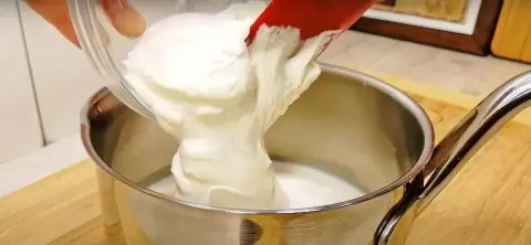 Крем ставится на огонь и кипятится, постоянно помешивая. После загустения в крем добавляется сливочное масло, что делает его невероятно нежным и похожим на вкус пломбира. Крем оставляют остывать под пленкой в контакт.
