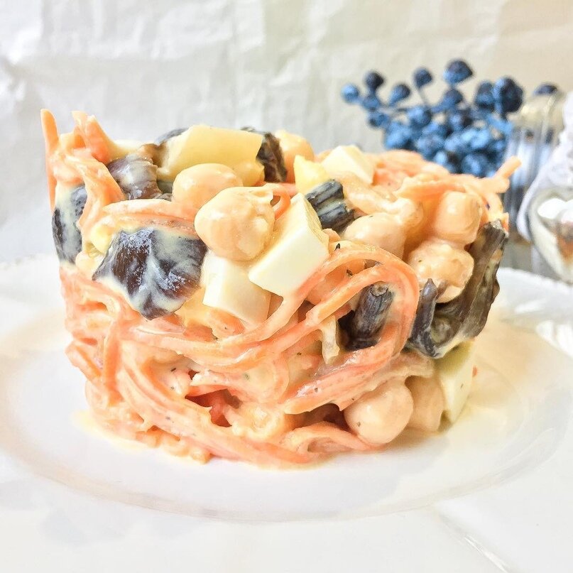 3. Яйца нарезать кубиками и смешать с морковью, жареными грибами и нутом. Заправить все сметаной, добавить соль и специи по вкусу.