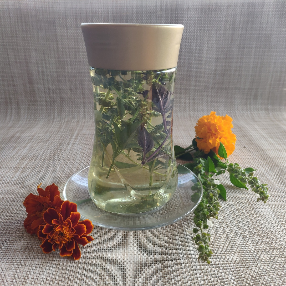 Перед тем как добавить базилик, его следует тщательно промыть и высушить, чтобы избежать попадания влаги. Некоторые предпочитают не мыть базилик, если он выглядит совершенно чистым. После этого цветоносы добавляются в теплое масло и оставляются на несколько дней для настаивания при комнатной температуре.