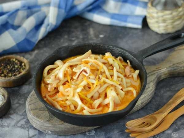 В добавленный соус аккуратно положите нарезанных кальмаров и тушите на среднем огне 2-3 минуты. Важно не переварить, иначе кальмары станут резиновыми. В конце добавьте сметану, тщательно перемешайте, не доводя до кипения — достаточно прогреть 20-30 секунд до первого пузырька.