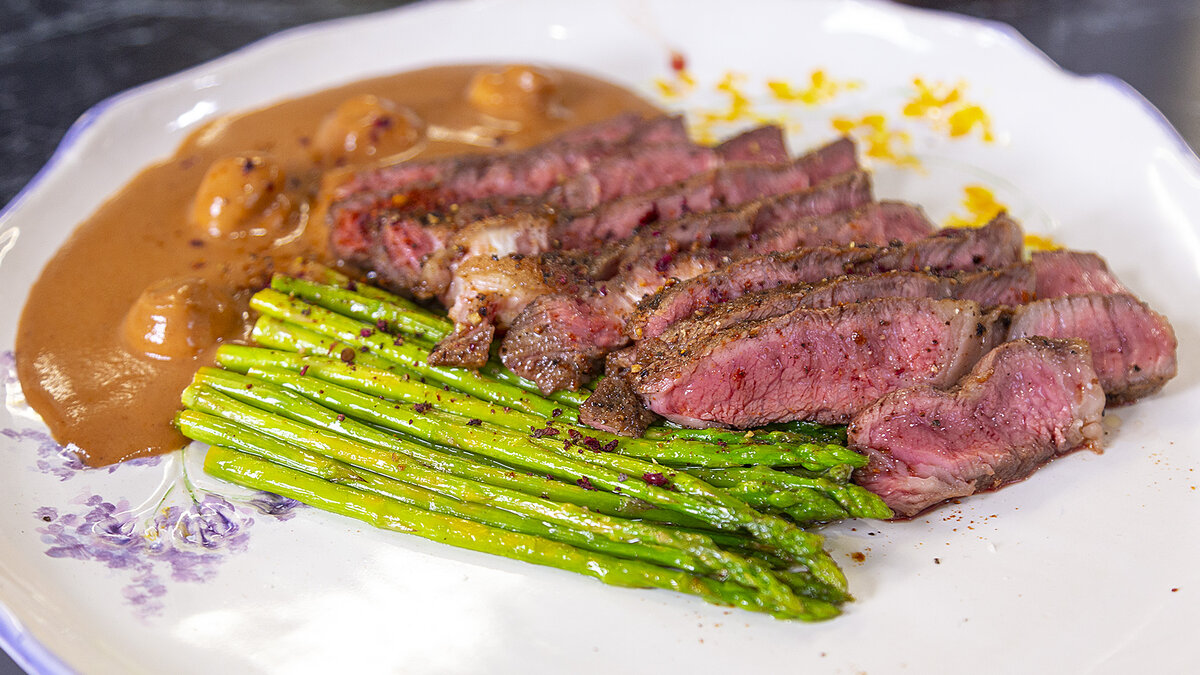 На сковороде разогревают масло и обжаривают стейки до золотистой корочки, после чего перемещают их в духовку при температуре 100 градусов на 15-17 минут. Параллельно обжаривают спаржу на сливочном масле с чесноком, сбрызгивают лимонным соком и солят. На тарелку выкладывают стейк, спаржу и изысканный соус, посыпая все сумахом. Это не только праздник для глаз, но и гастрономическое удовольствие!