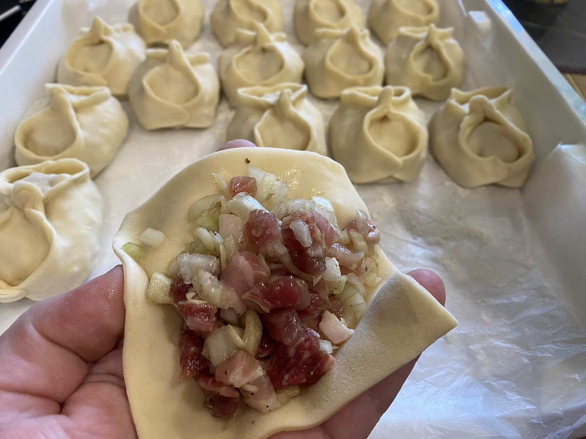 Правильное тесто — залог успеха. В его основе должны быть вода, соль, растительное масло и яйцо. Добавление яйца придаёт тесту эластичность и прочность, что облегчает его раскатку. Месить тесто стоит долго, пока оно не станет гладким и неподатливым. После этого заверните его в пленку и дайте отдохнуть 30-40 минут. Это позволит клейковине расслабиться и сделает тесто мягким и податливым — идеальным для формирования мантов.