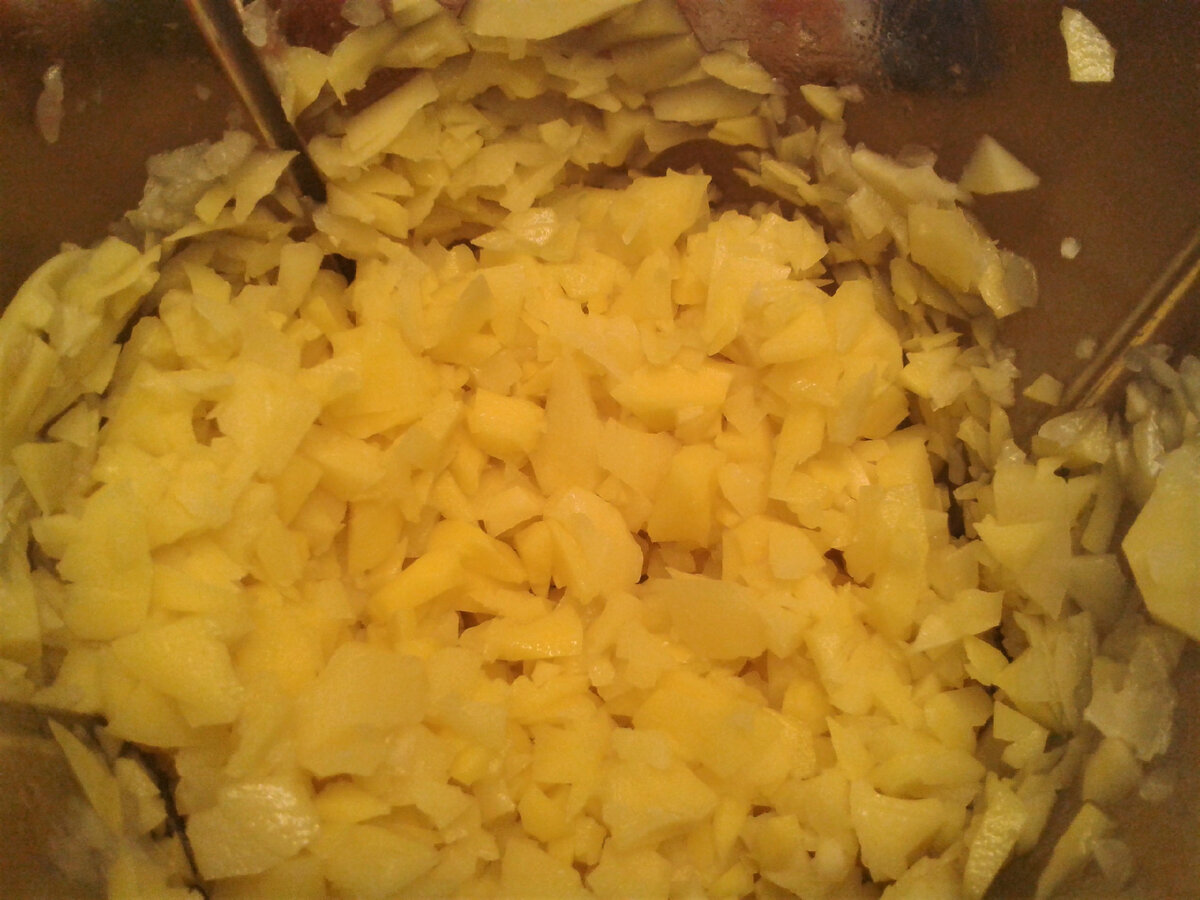 Тушить начинку необходимо почти до полной готовности, так как слоеное тесто готовится довольно быстро. В конце процесса добавить нарезанную зелень, тщательно перемешать и дать немного остыть.