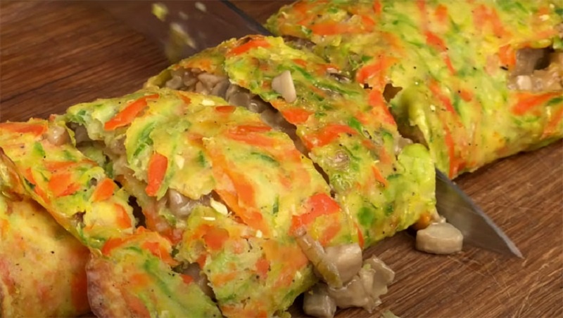 Прежде всего, кабачок следует натереть на крупной тёрке и отжать лишнюю жидкость, чтобы основа рулета получилась плотной. Затем натереть морковь и соединить все ингредиенты в миске. Выложите массу на подготовленный противень и выпекайте при температуре 200 °C около 20 минут до золотистой корочки.