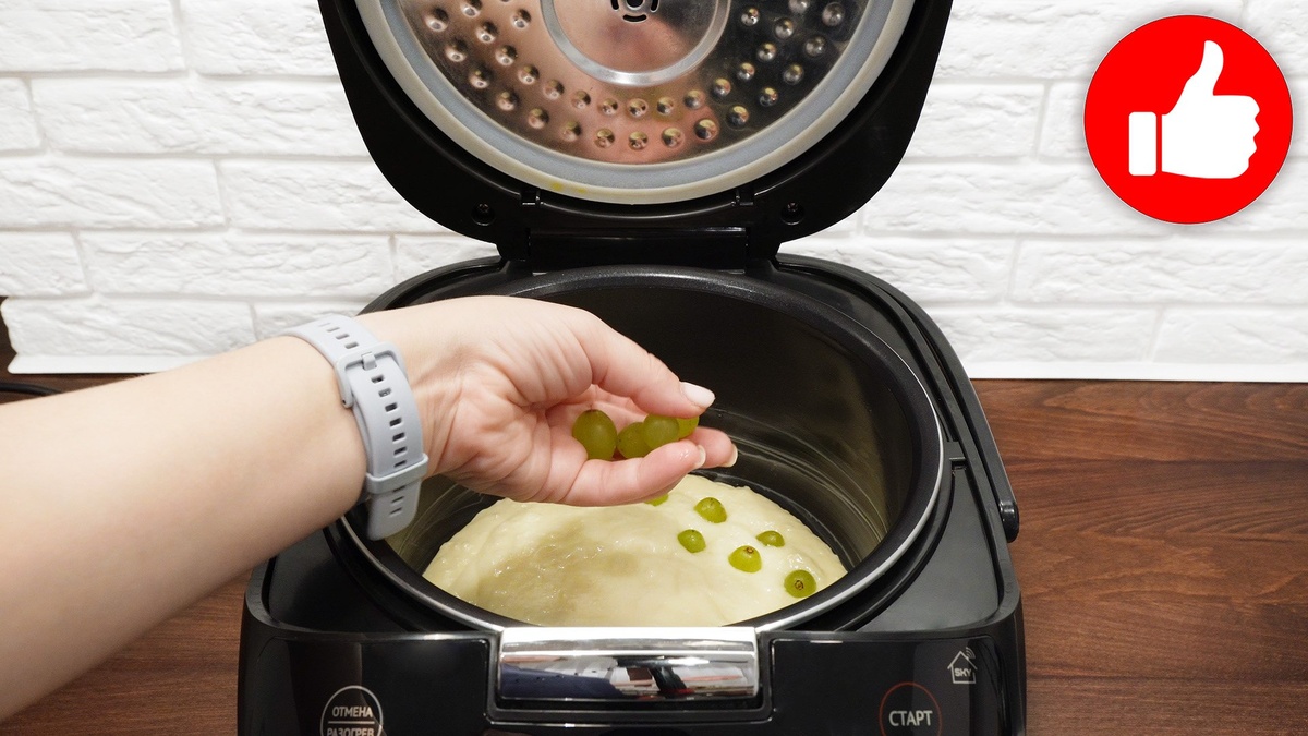 Далее смазанный растительным маслом чашу мультиварки заполняем тестом. В тесто аккуратно втирайте виноград, чтобы он равномерно распределился.