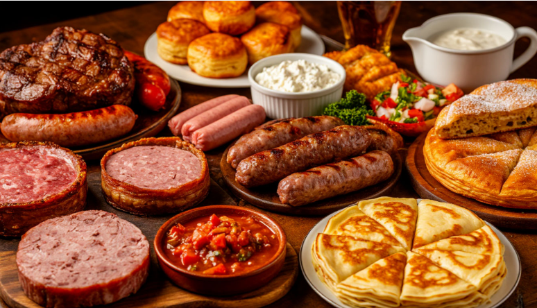 - Жареное мясо (свинина, говядина), колбасы и студень.