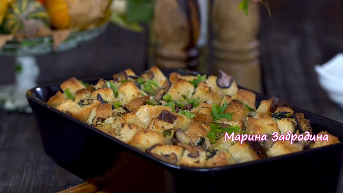 В глубокой миске смешать обжаренный хлеб, лук с сельдереем и шпинатом, а также грибы и зелень. Хорошо перемешать.