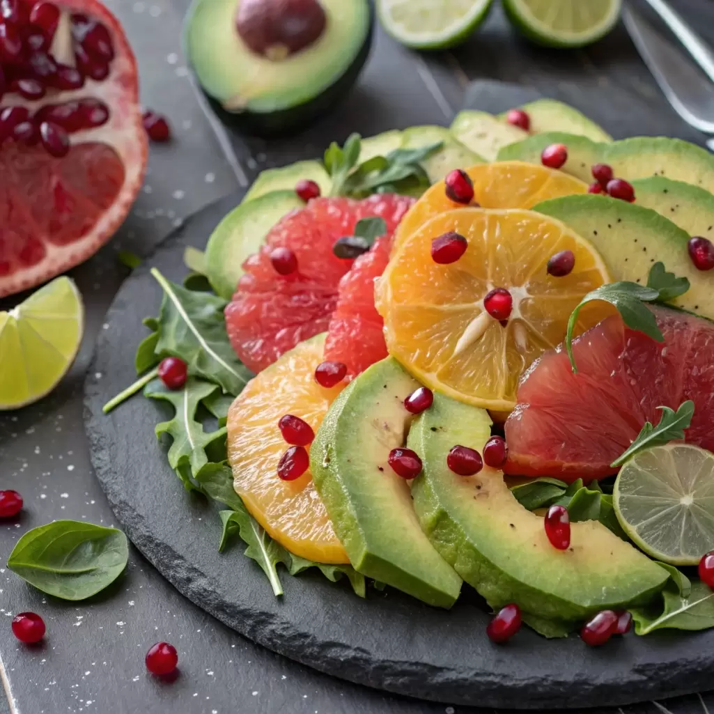 - Цитрусовый салат с авокадо и гранатом — фантастическая комбинация свежести и легкости.