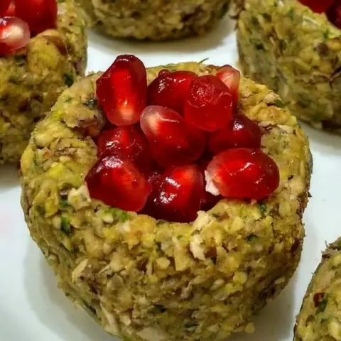 Отваренную фасоль также следует измельчить в блендере и соединить с зеленой смесью. Важно добиться такой текстуры, чтобы масса легко лепилась. Создавать небольшие шарики, примерно с размером грецкого ореха, и в центре каждого делать углубление. В финале украсить получившиеся пхали зернами граната — это не только эффектно, но и придаст свежесть блюду.
