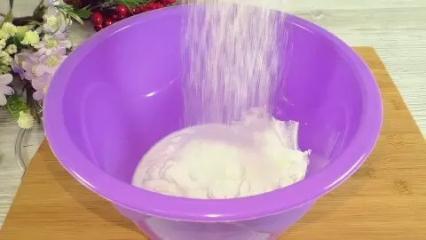3. Добавив муку и разрыхлитель, замесить тесто. Оно должно быть мягким и не липнуть к рукам, для чего потребуется 300-330 г муки.