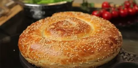 Пирог помещается на противень, предварительно застеленный пергаментом. Сверху его смазывают взбитым яйцом и, по желанию, посыпают кунжутом. Оставьте пирог на 10 минут для расстоек, а затем выпекайте при температуре 180 градусов на протяжении 40-50 минут.