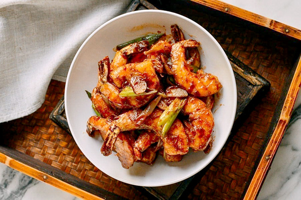 Креветки возвращаются в сковороду, добавляются соевый соус, шаосинское вино, сахар и перец. Всё перемешивается и обжаривается короткое время, чтобы все ингредиенты соединились в одно удивительное блюдо.