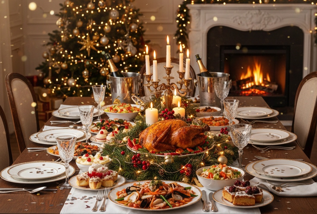 Десерты тоже должны подчеркивать дух праздника. Торт «Красный бархат» или кулинарные шедевры с ягодными муссами станут отличным завершением застолья. Имбирное печенье и шоколадные трюфели удивят необычными сочетаниями вкусов. Из напитков рекомендуется выбрать глинтвейн или красное вино, а для безалкогольной альтернативы лучше всего подойдут морсы и гранатовый сок.